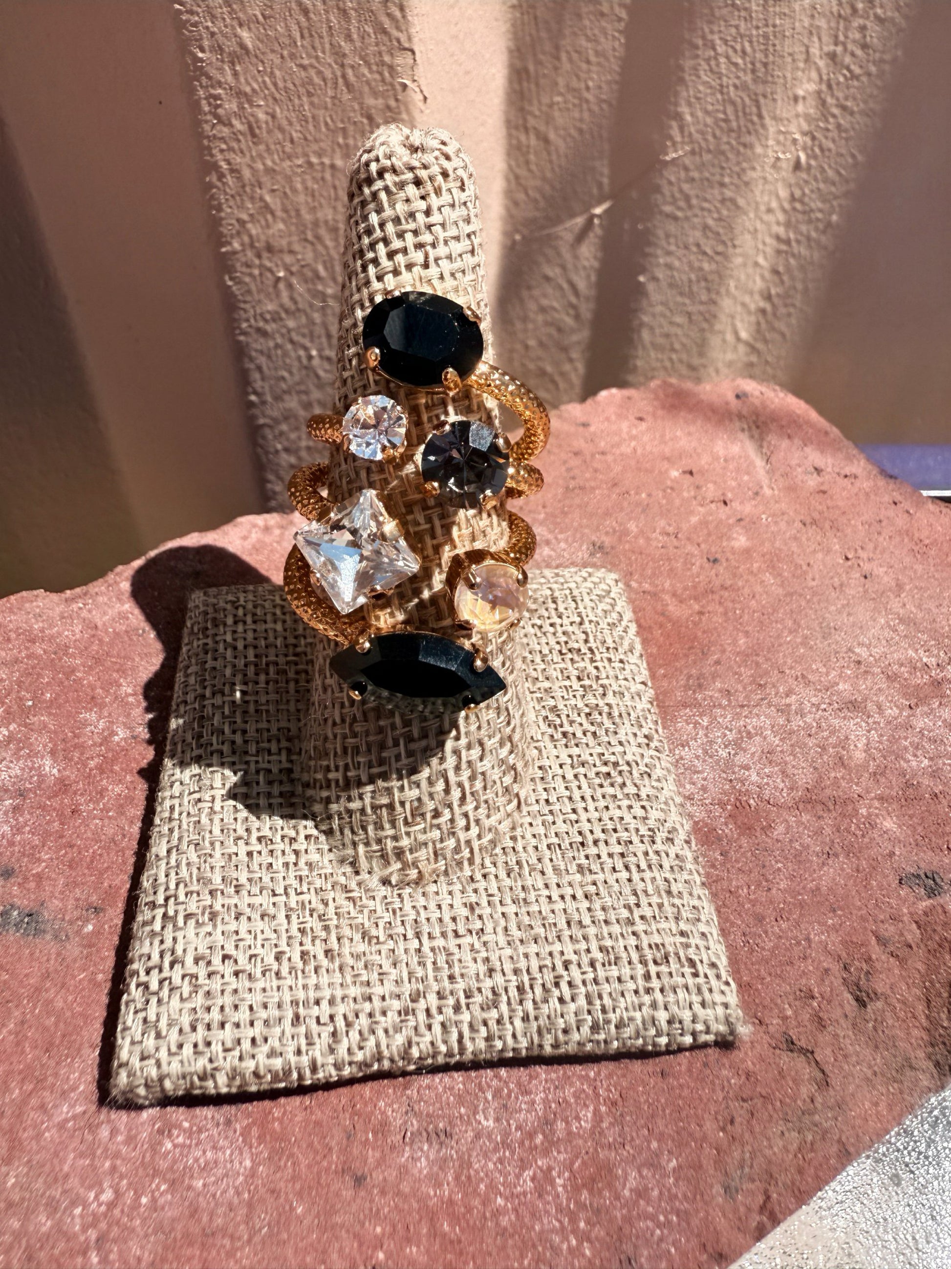 Expertly crafted and designed, this Black and Clear Stack Statement Ring offers a bold and modern look. The combination of black and clear stones creates a stunning contrast, while the stack design adds depth and dimension. Sized at 6.5, this ring is the perfect statement piece for any occasion.