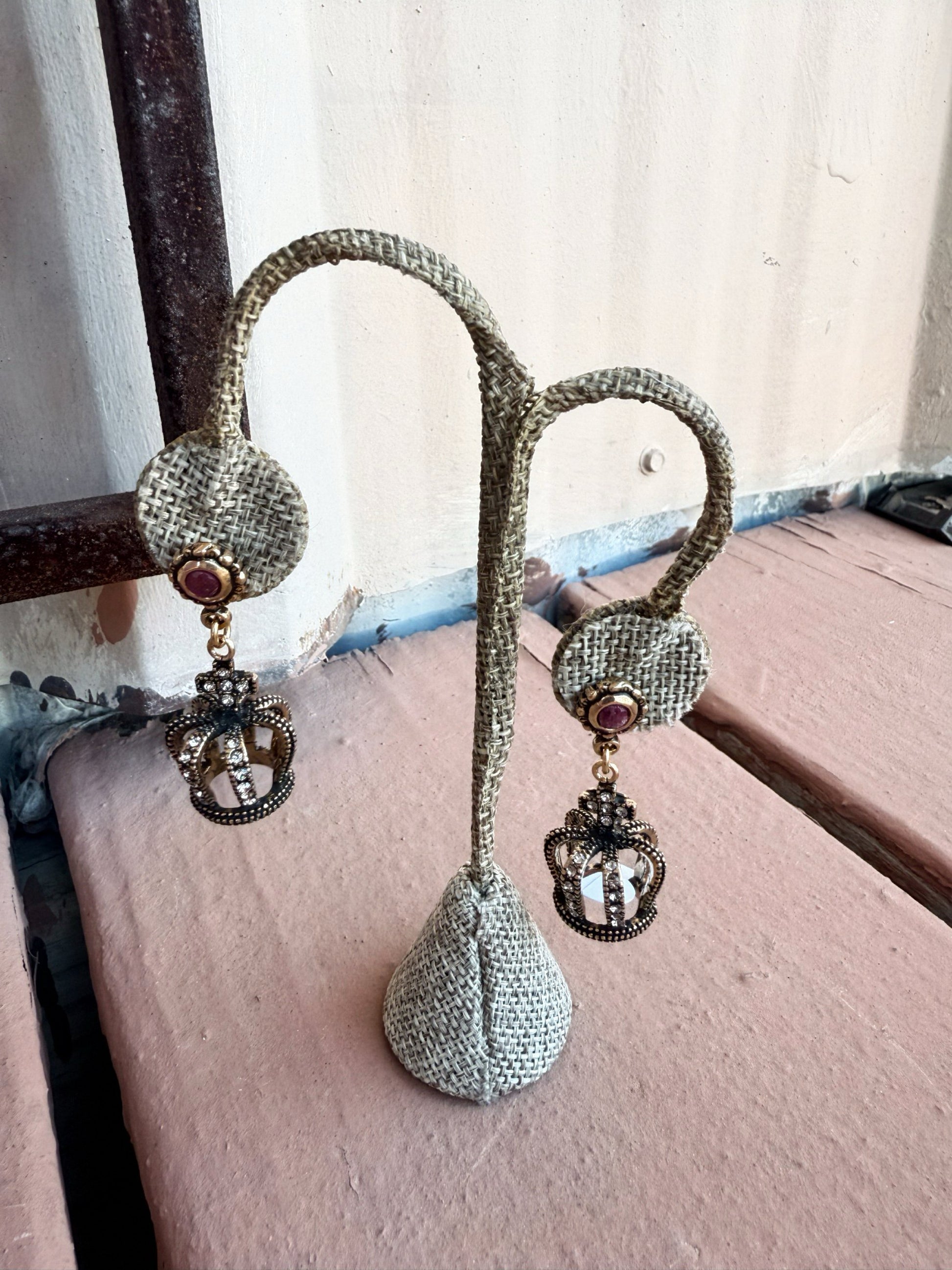 Elevate your look with these stunning Crown Earrings adorned with dazzling Ruby stones. The intricate crown design adds a touch of royalty and the vibrant rubies add a touch of color. Perfect for any occasion, these earrings are sure to make a statement.