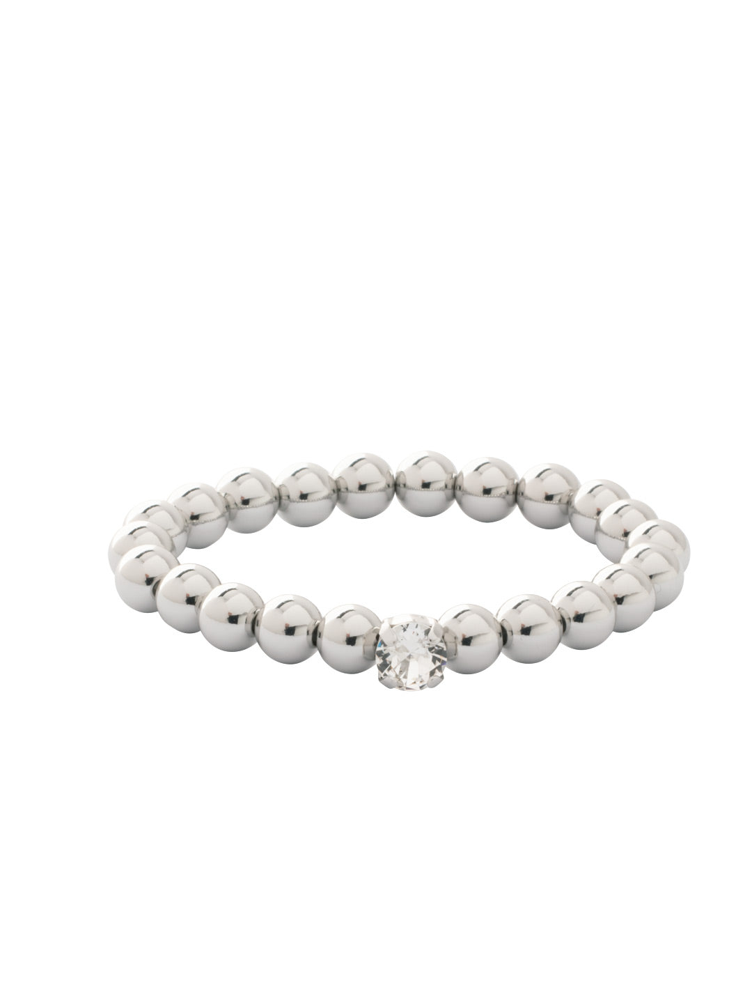 Single Crystal Stretch Bracelet features repeating metal beads and a single round cut crystal on a multi-layered stretchy jewelry filament, creating a durable and trendy piece.